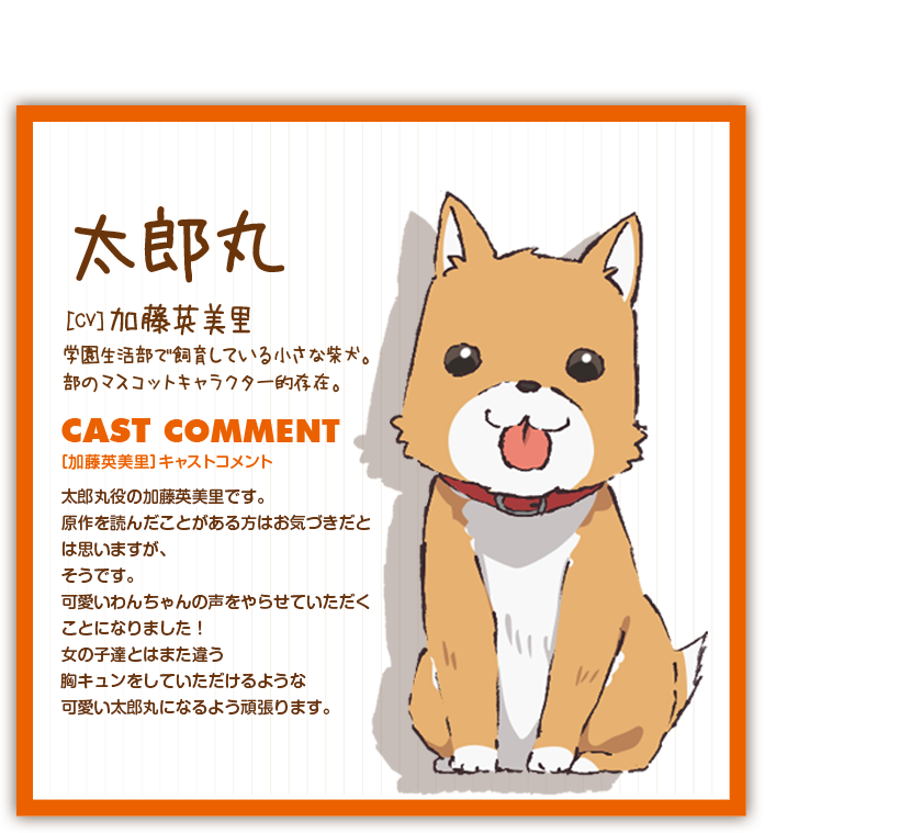 学園生活部で飼われていた柴犬。元はショッピングモールで立て籠もっていた美紀たちと一緒にいたが、逃走。遠足にきていた由紀たちに拾われ、学園生活部に入部を果たす。由紀には懐いているが、美紀は警戒している。