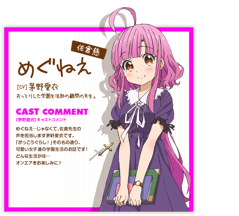 巡ヶ丘学院高校の現代国文の女性教師。学園生活部の顧問。愛称は「めぐねえ」。