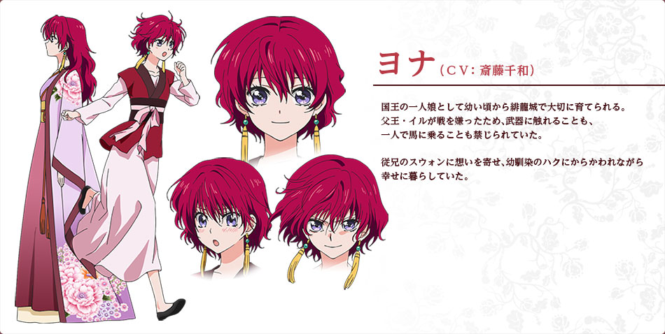 「高華王国」の皇女にして、国王の一人娘である「ヨナ」。最初の頃は箱入り娘のような女性であったが、とある事件で追われる身となってからは、少しずつだが逞しくなっていった。テコでも動かないほど頑固な一面を持つが、その根源には、誰かを守りたい・役に立ちたいという想いがある為だ。そういったことから武器も扱うようになり、守られるだけの華奢な存在ではなく、仲間を守る強さを身に付けていく。敵を前にした時の鋭い眼光と揺れる赤髪は、思わず息を飲んでしまうほど圧倒させるものがある。