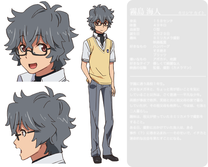 「小諸学園」に通う本作の主人公。祖父の遺した8mmカメラで撮影することが趣味。背が低いことを気にしている以外は、ごく普通の高校生。行動力があり、自分の気持ちに正直でまっすぐな性格だ。ところが妄想癖があり、それを口に出してトラブルになることもある。ひょんなことから転校生「貴月イチカ」と同居することになり、一緒に過ごしていく中で彼女に惹かれていく。声を演じた「島﨑信長」本人も、「海人」のまっすぐさが好きであり、「海人」を演じたことは「運命の出会い」とコメントをしている。そんな「海人」が作中どのように活躍するのか、視聴して確認して欲しい。