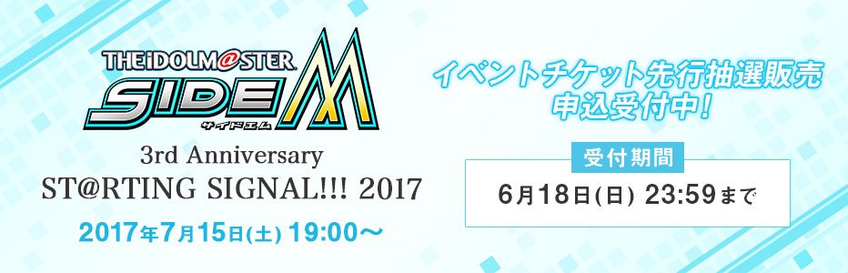 また、番組内では『アイドルマスター SideM』の3周年を記念したスペシャルイベント「THE IDOLM@STER SideM 3rd Anniversary ST@RTING SIGNAL!!! 2017」を、7月15日(土)に「ニコファーレ」にて開催する事を発表。イベントでは、『アイドルマスター SideM』にまつわる音楽、ゲーム、アニメなどの様々なプロジェクトに関連する最新情報が発表されるそうだ。イベントチケットは6月7日の22時より「イープラス」にて先行抽選販売申し込みが開始されている。また、「ニコニコ生放送」での配信も決定しているとの事。