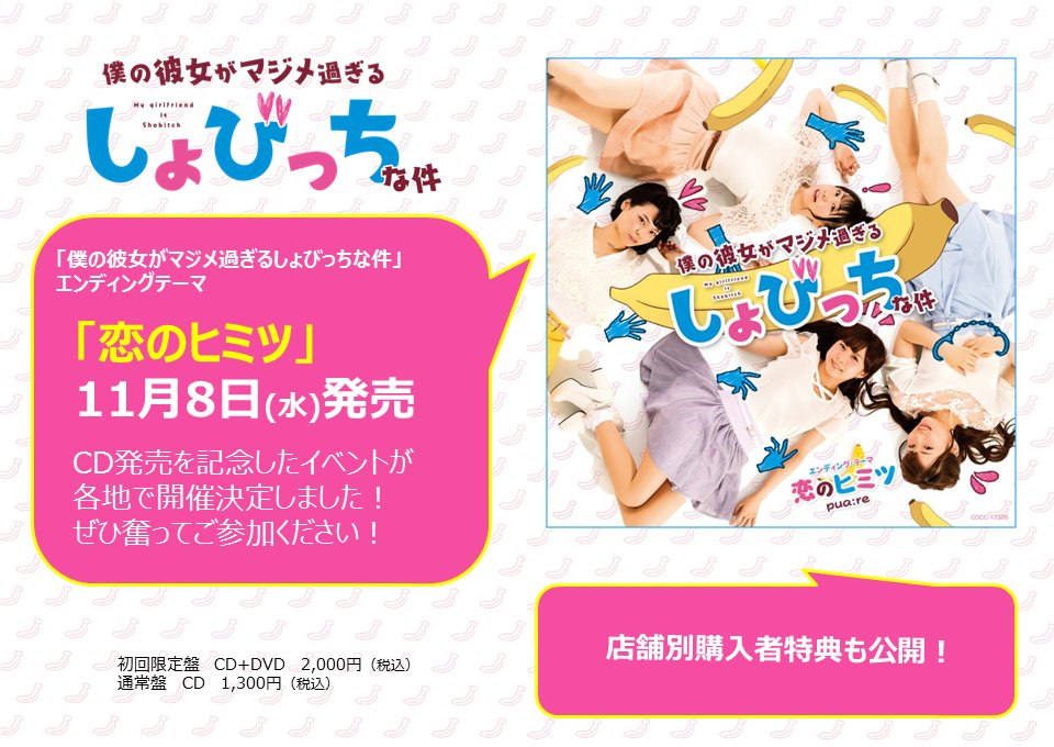 TVアニメ『僕の彼女がマジメ過ぎるしょびっちな件』EDテーマ「恋のヒミツ」発売記念イベント開催が決定!!EDテーマを歌う「pua:re(ピュアレ)」のメンバーによる、リリースイベントが決定。イベント参加方法を確認し是非参加してみよう!