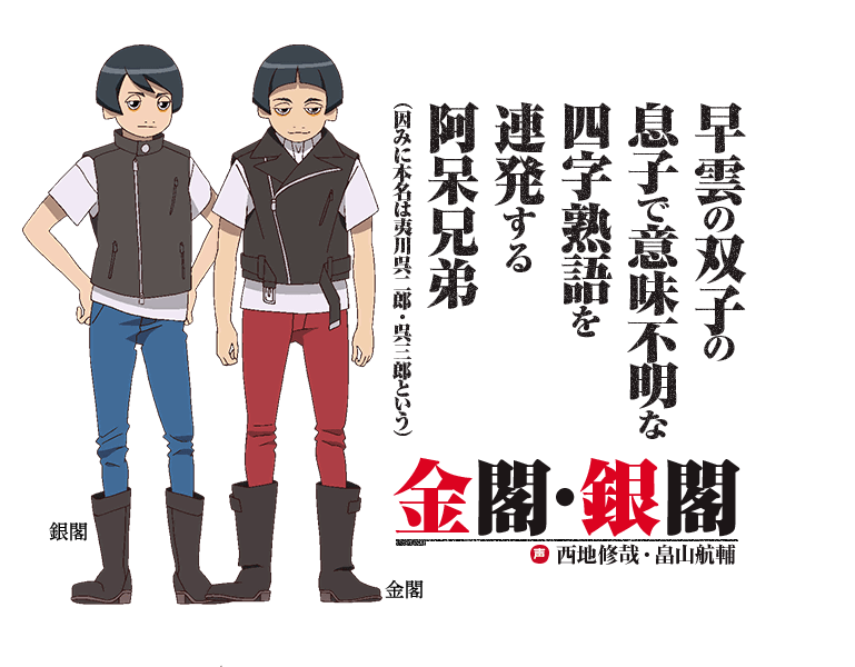 京都で暮らす「人に化けた狸」と「天狗」は、人間社会にすっかり溶け込んでいる。そんな「人に化けた狸」の中でも、名門の家系とされる「下鴨家」には、三男「矢三郎」を始め個性豊かな4兄弟がいた。そんな彼らにちょっかいを出すのが、「下鴨家」に匹敵する名門「夷川家」の双子。本名は兄「金閣」が「夷川呉二郎」、弟の「銀閣」は「夷川呉三郎」というのだが、本名で呼ばれることはほとんどない。二人はいつも一緒におり、弟「銀閣」は兄をとても尊敬している。とはいえ、毎度意味不明な四字熟語を並べる彼らは阿呆そのもの。やり過ぎる事もあるが、見ているだけなら面白い双子である。