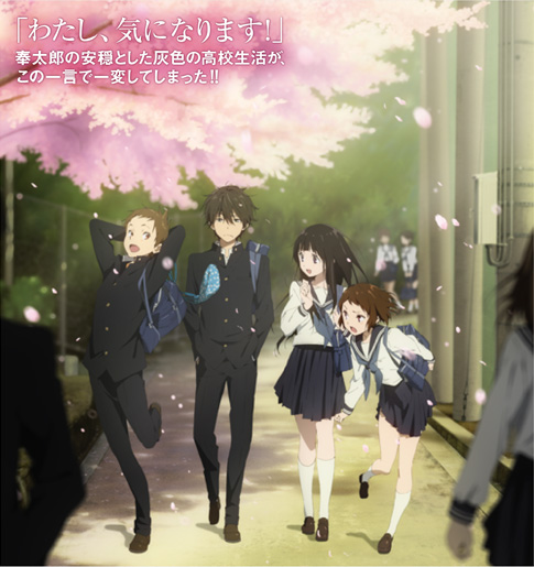 文化系部の活動が活発なことで有名な進学校「神山高校」。そこで「古典部」という廃部寸前の部活に入部した「千反田える」。『氷菓』に登場する彼女は豪農と言われる「千反田家」のお嬢様で、溢れる清楚さや奥ゆかしさが整った黒髪とマッチし、正に和風美人!! といった人物。その性格は至って活発少女であり、一たびいろいろなことが気になると「なぜ? 」と探求心や好奇心のメーターが一気に上昇させる。 「わたし、気になります」と周りのメンバーを巻き込み、特に、余計な事はやらないという主人公の自称「省エネ人間」・「奉太郎(ほうたろう)」は彼女のパワーに振り回される。好奇心で目を光らせ、ワクワクする「える」が可愛らしく、「える」なら振り回されてもかまわない! と思う視聴者も多いことだろう。