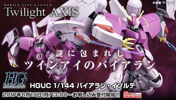 アニメ『機動戦士ガンダム Twilight AXIS』に登場する謎の部隊「バーナム」の「MS」である「バイアラン・イゾルデ」が「HGUCシリーズ」に登場。ツインアイを備えた頭部を始めとした独自の機体形状を新規造形で再現し、1/144スケールの組み立て式プラモデルとして製品化。2017年6月19日13時から「プレミアムバンダイ」にて予約受付開始となっている。