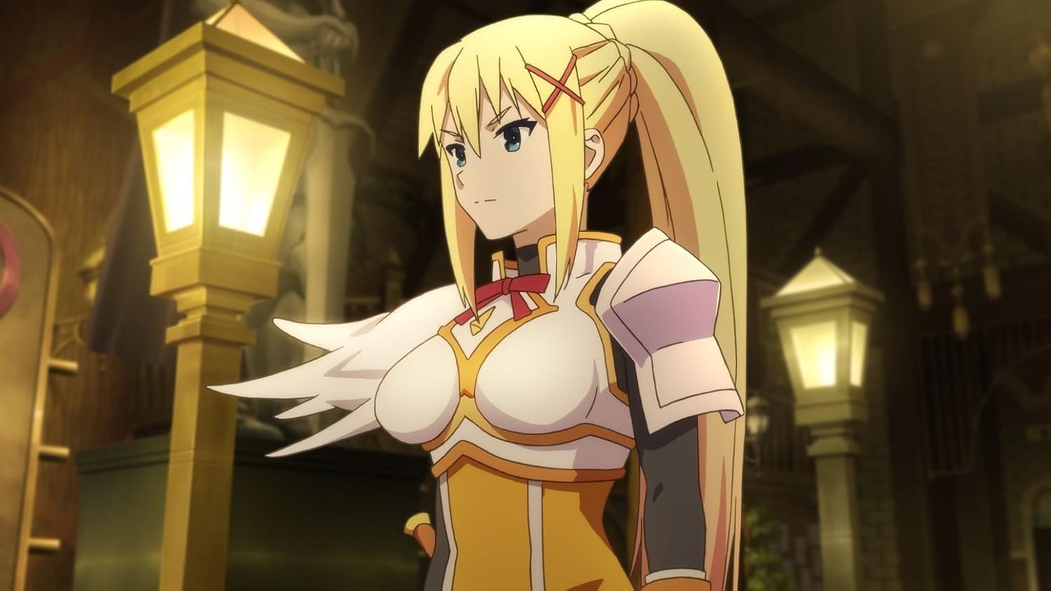 交通事故に巻き込まれて死亡した16歳の少年「佐藤和馬(カズマ)は、死んだ先で女神の「アクア」から、「強力な武器や特殊能力を授けるから、異世界に転生して魔王を倒してほしい」と頼まれる。「カズマ」はそれを承諾し、武器や特殊能力の代わりに「アクア」自身を異世界に連れていくことを選択する。だが「アクア」は、異世界のことはほとんど何も知らないポンコツ女神であった。問題だらけのパーティメンバーに囲まれた彼の旅路を描いた異世界ファンタジー『この素晴らしい世界に祝福を!』。「ダクネス」は、「カズマ」のパーティーの一員のクルセイダー。、仲間を敵の攻撃から守ることを得意とするが、攻撃を受けることに喜びを見出すマゾヒストで、強大な敵と戦うことを求めて「カズマ」のパーティに加入したという過去を持っている。能力のすべてを防御に注いでいるため、攻撃面においてはまったくの役立たずな彼女は、戦闘面だけでなく、日常面でもストーリーを賑やかしてくれる存在だ。v