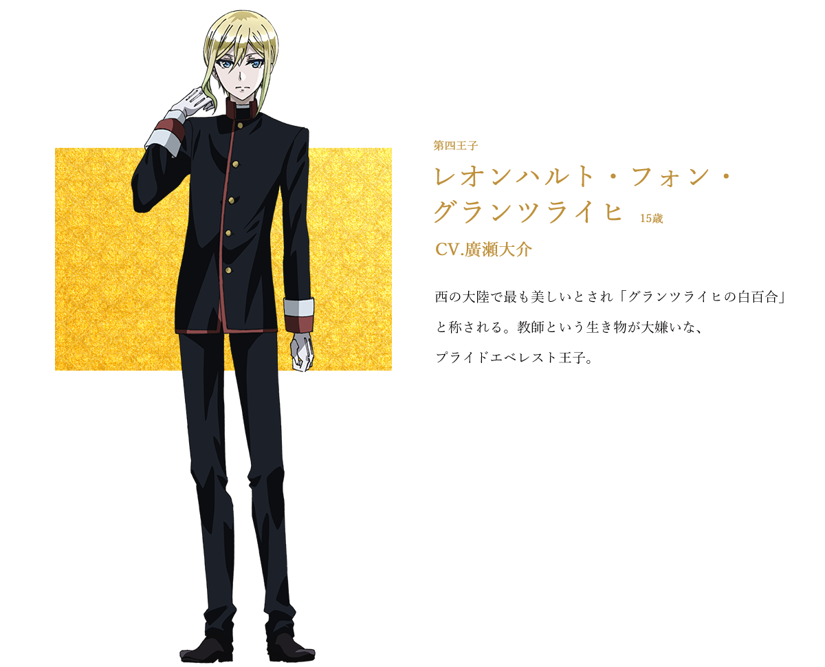 「グランツライヒ王国」の国王による提案で、長男である王太子にもしもの時があってはと、4人の弟たちの教育のため「王室教師」に主人公「ハイネ・ヴィトゲンシュタイン」が選ばれ、クセのある王子たちに手を焼く王室コメディ。その4兄弟中の1人で勉強嫌いな彼は、テストの結果が思うようにいかず逃げ出してしまう問題児で、勉強から逃げ続けるうちに体力がつき運動能力が高くなった。西の大陸でもっとも美しい「白百合」と称されるほどのイケメン金髪プリンスだが、ダメっぷりさえも気品が漂い、憎たらしくも放っておけない愛すべきキャラクターである。