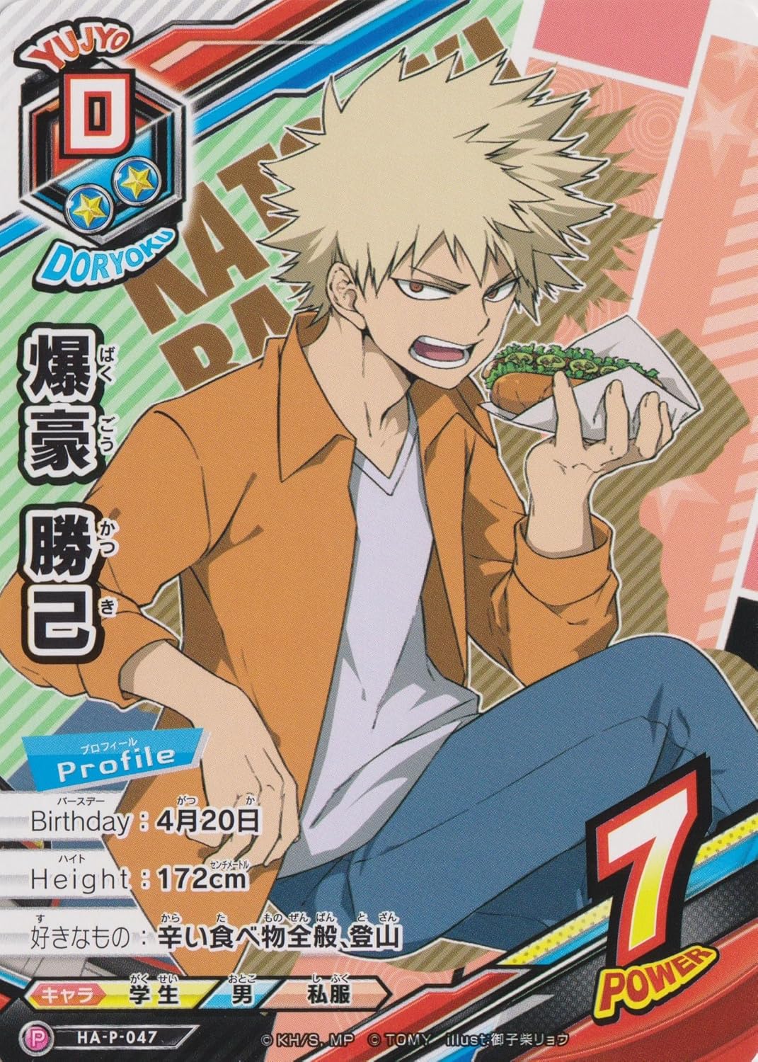 主人公「緑谷出久」の幼馴染で、生まれ持った個性・能力は掌から汗を出す要領で爆発させる事で、その反動による推進力や攻撃力に応用している。常に自分が一番である事を信条とし、個性・能力を持たない主人公を見下し、ヒーロー養成学校である「雄英高校」に進学したが、何故か主人公も同じ学校に進学し、同じヒーローを目指す事に怒りを覚える。これは過去に自分がヴィランに捕まってても足も出なかった所に主人公が能力もないのに助けに来たヒーローらしい行動に対する一種の嫉妬心の現れでもある。本来なら主人公のことなど気にせず、自分の能力を高めるだけでヒーローへの道は容易に掴めるはずだが、何だかんだで主人公にちょっかいを出すのは、厳しさの中の隠れた優しさであるとも見て取れる。色々な主人公に対するライバル像はあるが、この「爆豪勝己」は今までにない新しいタイプのライバル像とも言える。主人公とこの「爆豪」が真のヒーローになる日を楽しみに待ちたい。