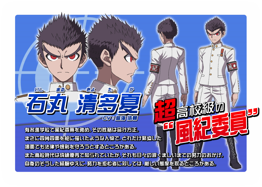 「超高校級」の実力や能力を持つ者だけが入学を許される「私立希望ヶ峰学園」。「超高校級の風紀委員」として入学した「石丸清多夏」は、風紀に関して超がつくほど真面目である。しかし熱血な努力家であるがゆえ、風紀に関すること以外では的外れな言動も……。そんな彼だが、正反対とも言える「超高校級の暴走族」の「大和田紋土」とはあることがきっかけで「兄弟」と呼び合う仲になる。原作はハイスピード推理アクションゲーム。