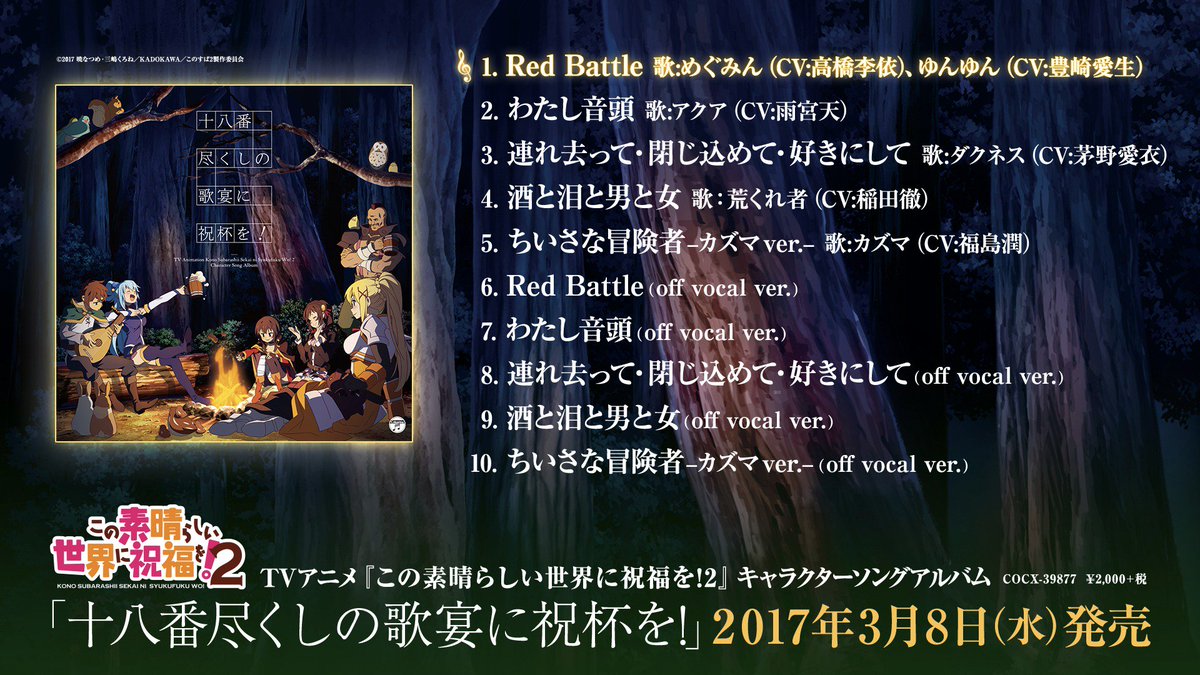 2/15(水)より放送された『この素晴らしい世界に祝福を!2』第6話のあらすじ&場面カットと、キャラクターソングアルバム「十八番尽くしの歌宴に祝杯を!」のジャケットイラストが公式サイトより公開中!