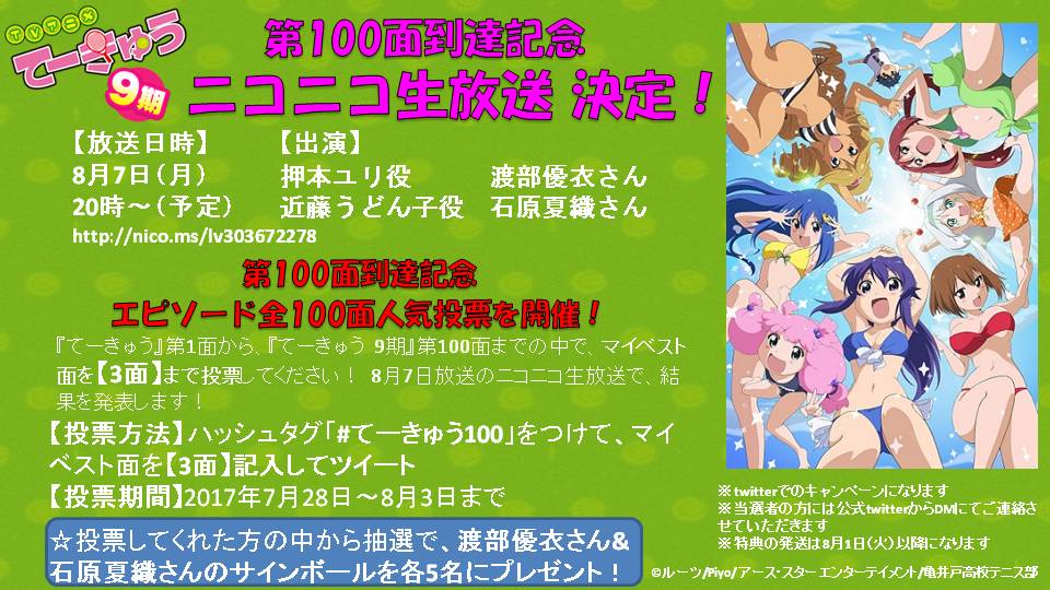 第100面到達記念として8月7日(月)20時~『てーきゅう 9期』のニコニコ生放送も決定!好評配信中の『9期』やこれまでの『てーきゅう』を振り返るトークコーナーや、視聴者に「好きな『てーきゅう』の楽曲は?」などと問いかけるアンケートコーナーを展開。さらに現在ツイッターにて募集中の「第100面到達記念 エピソード全100面人気投票」の結果を8月7日のニコニコ生放送で発表!