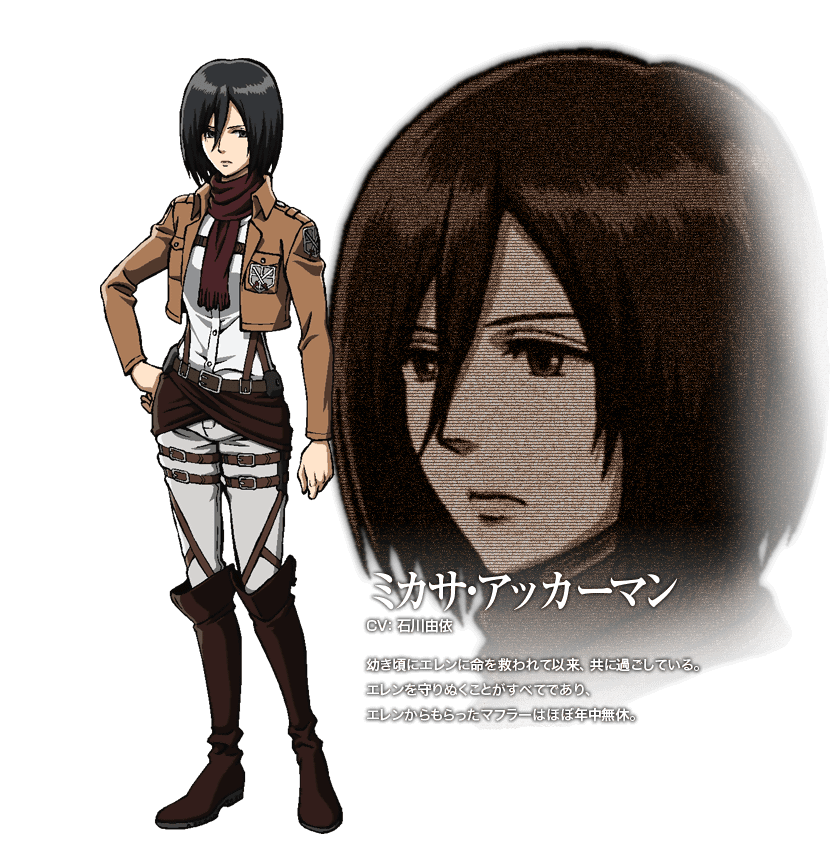 黒髪黒目の美人だが、その強さは身体、頭脳共に男性の比では無い。「訓練兵団」を主席で卒業、女性でありながらも前線で活躍し、立ちはだかる巨人を容赦なく切り伏せていく。物静かなタイプではあるが、兄弟同然の関係にある「エレン」のこととなると、冷静ではいられなくなる節があり何かとおっかない。「あのチビは調子に乗り過ぎた……いつか私が然るべき報いを……。」と漏らす場面もあり、「エレン」が連れ去られた時には更に恐ろしい台詞を吐いている。そんな彼女ではあるが、彼のことを恋人と勘違いされ頬を染めたりと、案外可愛らしい一面も。幼少期に「エレン」から貰ったマフラーは年中無休で身に着けている。