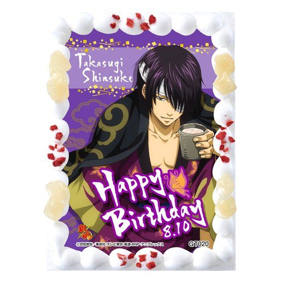「プレミアムバンダイ」より、アニメ『銀魂』に登場する「高杉晋助」が描かれた「キャラデコプリントケーキ」期間限定版が登場。「高杉」の誕生日である8月10日に向けたバースデーケーキとなっており、プリントもそれに合わせた誕生日ver.でデザインされている。