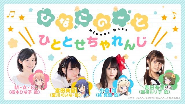 6月24日より、『ひなこのーと』最終回上映イベントが開催決定! 出演者は、「M・A・O(桜木ひな子 役)」、「富田美憂(夏川くいな 役)」、「小倉 唯(柊 真雪 役)」、「東城日沙子(萩野千秋 役)」、「高野麻里佳(中島ゆあ 役)」、「吉田有里(黒柳ルリ子 役)」。最終回上映の他、劇団ひととせのメンバーによる「劇団ひととせ“桃太郎”公演への道!」も実施。最後の最後まで『ひなこのーと』を堪能しよう! また、「AbemaTV」にて一挙放送、生放送特番「ひなこのーと〜ひととせちゃれんじ〜」を放送予定。こちらも合わせてチェックしておこう。