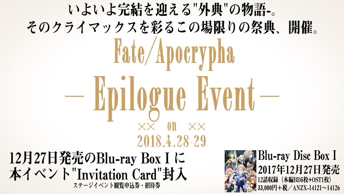 12月27日に発売となるBlu-ray BoxⅠに当イベントの”Invitation Card”( 「Fate/Apocrypha -Epilogue Event- ステージイベント観覧申込券」)が封入となりますので、参加希望の方は是非ゲットしておこう。また物販情報などは後日、発表される。
