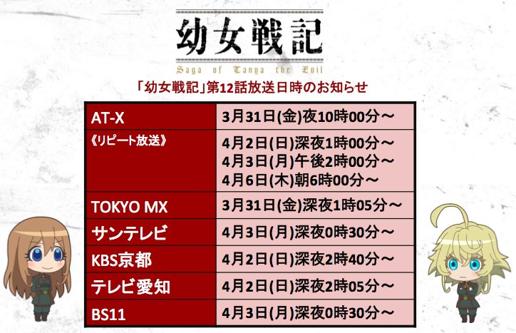 本日3/31(金)は『幼女戦記』第12話「勝利の使い方」が放送される。公式サイトでは、あらすじと先行場面カットが公開された。また、前回の『ようじょしぇんき』#11も公開中。放送日時も変更があるため要チェック! また、Blu-ray&DVD情報も更新!!