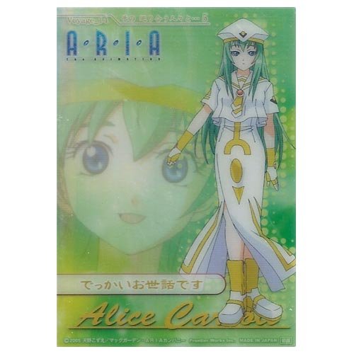 テラフォーミングされた火星の都市「ネオ・ヴェネツィア」でゴンドラの漕ぎ手「ウンディーネ」として日々成長する少女達を描く癒し系アニメ。「アリス・キャロル」は水先案内店「オレンジぷらねっと」に所属するウンディーネだ。ミドルスクール在学中にスカウトされただけあって漕ぎ手としてのセンスは天才的だが人づきあいがやや苦手。しかし主人公「水無灯里」達と出会ってからは徐々に打ち解けている。淡い緑のロングヘアー。将来が楽しみな「ウンディーネ」である。