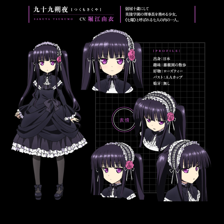 自身の魂を具現化させて武器を創りだす能力「焔牙」の適性を持つ者は、千人に一人と言われている。そしてその能力を持つ者に戦う術を指南する学校「昊陵学園」では、生徒たちが「絆双刃(デュオ)」というパートナー制度によって互いを高め合っていた。その中の一人「九重透流」と、そのパートナーである「ユリエ・シグトゥーナ」を中心に学園での激しいバトルが描かれる『アブソリュート・デュオ』。若干10歳にしてこの「昊陵学園」の理事長を務め、「操焔の魔女(ブレイズ・デアボリカ)」の異名を持つ少女が「九十九朔夜」である。非常に可愛らしく幼い外見であるが、冷酷非道な性格を持っている。そんな彼女は黒のゴスロリドレスに身を包み、頭にはバラの花がついたボンネットをつけている。可愛らしい人形のような少女「朔夜」が望む「絶対双刃(アブソリュート・デュオ)」とは一体……!?