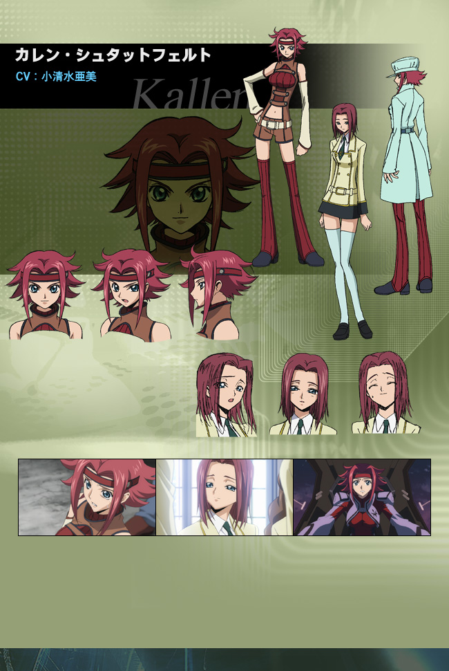 超大国「神聖ブリタニア帝国」によって、日本は占領され、「エリア11」と呼称されていた。「ブリタニア」に恨みを持つ少年、主人公の「ルルーシュ・ランペルージ」は、謎の少女「C.C.」から授かった絶対遵守の力「ギアス」を使い、日本独立のため、「ブリタニア帝国」に戦いを挑むのであった――。「紅月カレン」は主人公が通う「アッシュフォード学園」の生徒であり病弱なお嬢様である。しかし、それは偽りの姿であり、本来は快活で直情的な性格でサバサバしている。レジスタンス組織のメンバーであり、レジスタンス活動により学園を欠席することが多々あるため、病弱を装っている。「ルルーシュ」こと「ゼロ」が率いる黒の騎士団のエースパイロットを担う実力派でもある。最初は「ゼロ」に不信感を持っていたが、次第に彼に対して信頼と同時に好意も抱くようになる。彼女のバストサイズは不明であるが、描写を見る限りではかなりの巨乳である。そんな彼女が勇ましく戦う姿は見物であり、視線の行方はつい乳にいってしまう。
