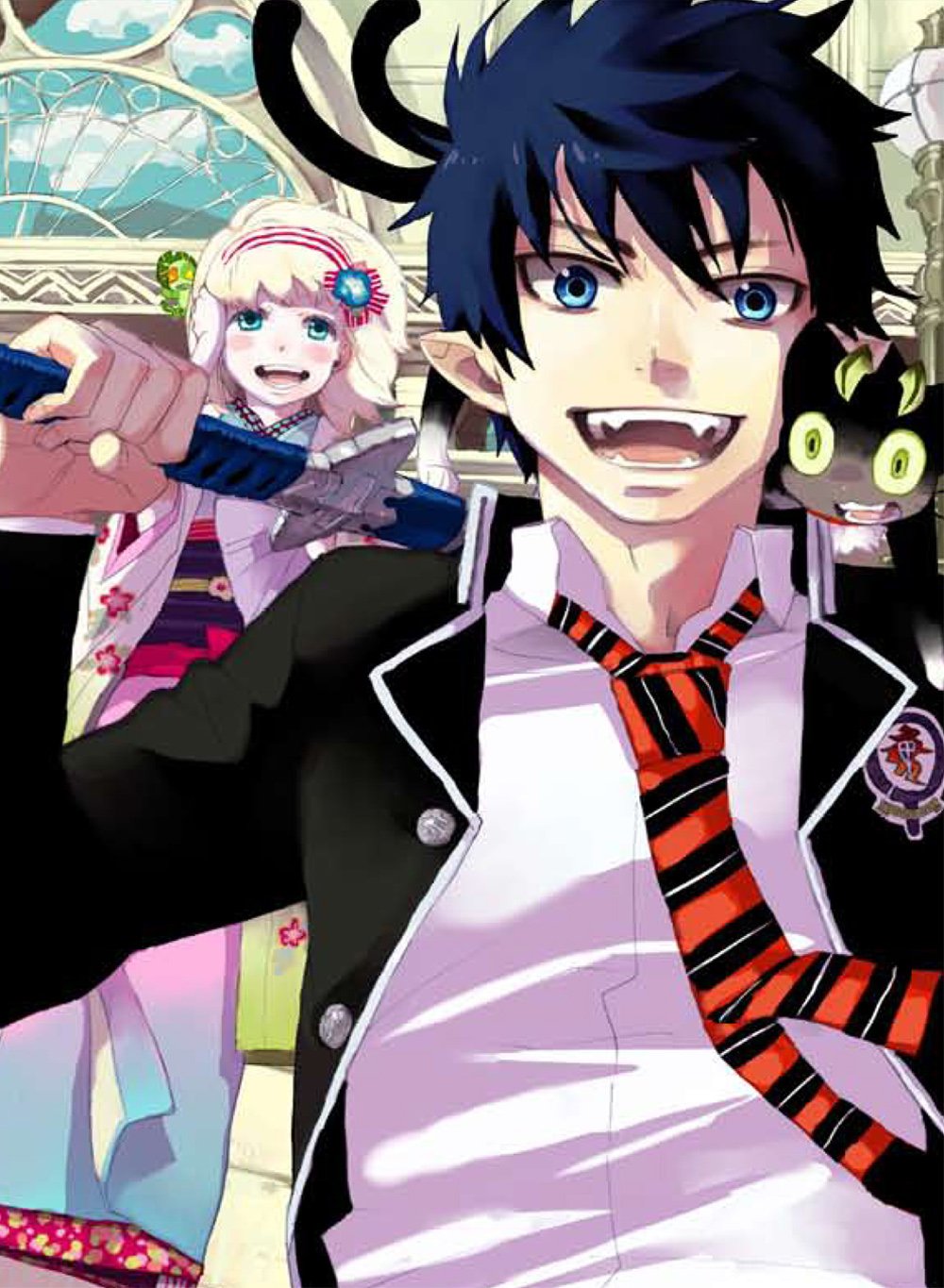 人間の住む世界「物質界(アッシャー)」と悪魔の住む「虚無界(ゲヘナ)」が存在する世界。修道院で孤児たちと暮らしていた「奥村燐」はある時、人間の欲望や物質に憑りつく悪魔の存在を知る。育ての親である「藤本獅朗」が自分の中に潜む「魔神・青焔魔(サタン)」の力によって死んでしまったことを機に「祓魔師(エクソシスト)」となり「魔神・青焔魔」を殺すことを決意する。「正十字学園」高等部1年、祓魔塾」へと通うことになった「奥村燐」。性格は正義感が強く喧嘩っ早い。あらゆる勉強が苦手で同級生からは馬鹿にされることも多いが、「青焔魔」と人間の間にできた子供であるため「炎」の力を継いでいる。普段はその力が解放されないための「降魔剣」「倶利伽羅」の2つの刀を所持して力を抑えている。この両剣を使うため「祓魔師」の称号は「騎士(ナイト)」を志望している。剣を抜くと「青焔魔」の力が解放され身体から青い炎が噴き出してくる。