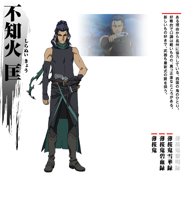 幕末の新撰組を題材にしたアニメ作品。史実とほんの少しのファンタジーを織り交ぜた緻密なシナリオは、未だ多くのファンの心を掴んで離さない。本作で登場する「不知火匡」は褐色肌に青い髪のいかつさ全開の男である。戦闘では銃を使い、少し戦闘狂と言えるレベルの手強い敵だが、時には仲間になり、時にライバルになったりと新撰組隊士の成長には欠かせない人物である。ぜひその兄貴肌を作品内で感じていただきたい。
