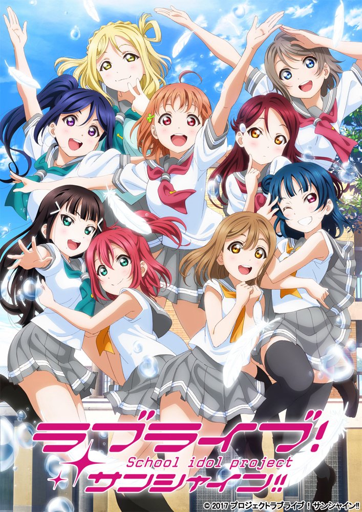 物語の舞台は静岡県沼津市・内浦。統廃合の危機にある女子校「浦の星女学院」を盛り上げようと9人の少女たちはスクールアイドル「Aqours」を結成した。惜しくも「ラブライブ!」の地方予選で敗退してしまい、次の出場に向けて活動を続けていくのだが……。本作は2016年7月から放送されていたアニメの第2期にあたる。「浦の星女学院」の制服は前開きのセーラー服。配色は灰色と少し地味な印象を受けるのだが、学年ごとに違うリボンが華やかである。第1期では夏服も披露されたが、こちらは1年生と2・3年生でデザインが差別化されているのが面白い。ノースリーブの制服はなかなかお目にかかれないのではないだろうか。