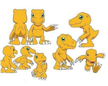 まずは第1作目より、主人公「八神太一」の「パートナーデジモン」である「アグモン」を紹介。食いしん坊でのんびり屋、無邪気で熱い性格。必殺技は口から火の玉を吐く「ベビーフレイム」。大きい恐竜のような口とギザギザの歯で笑う笑顔がとてもキュート。加えてパートナーの「太一」やその他の子供たちにも、友達感覚で接するところが何ともいえずかわいらしい。細かいことを気にしない鈍感タイプなので、場を和ませるほほえましいエピソードが多い。