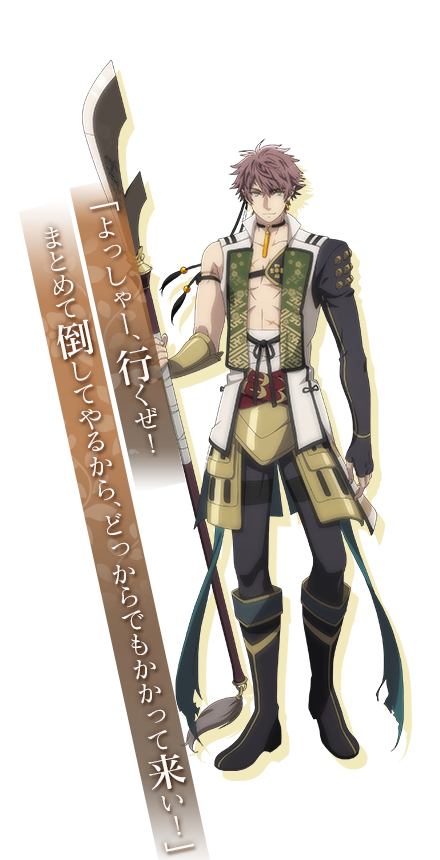 竹を割ったような性格をした、体格の良い槍使い。戦ではいの一番に敵陣へ斬り込みに行く暴れん坊のため、生傷が絶えない。