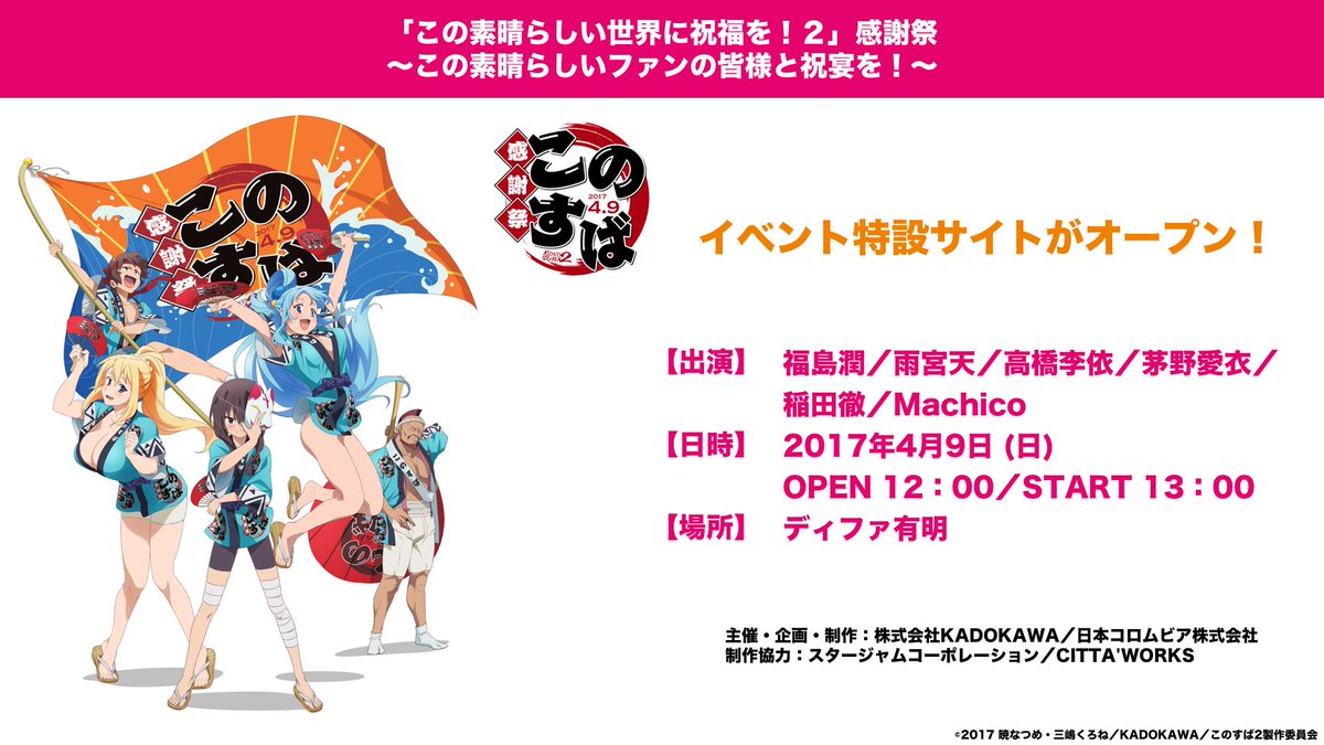 3/15(水)の第10話の放送で最終回を迎えた『この素晴らしい世界に祝福を!2』、主要キャラクターを演じる声優陣を迎え、ファンの皆様と一緒に感謝祭を盛り上げよう!! イベント記念限定のグッズ販売も行われるため、グッズ情報を要チェック!!