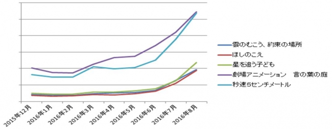 TSUTAYAでは、大ヒット公開中の映画『君の名は。』で監督を務める新海誠監督作品のDVDレンタル回数が、本作の大ヒットの影響で劇場公開前後比約3,5倍に急増。