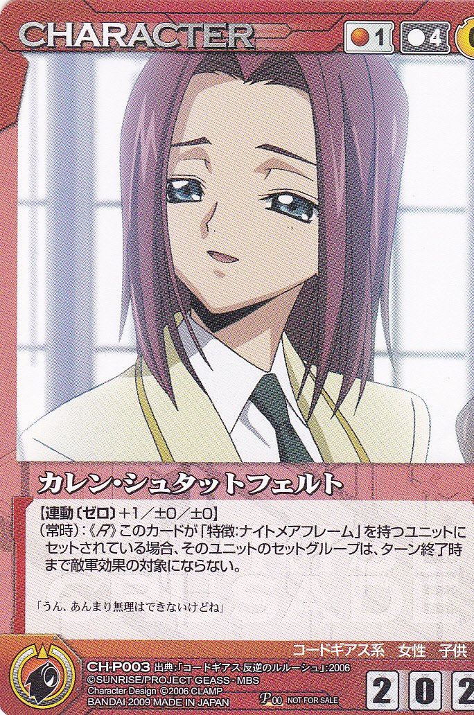 主人公「ルルーシュ・ランペルージ」や「枢木スザク」が通学する「アッシュフォード学園」に同じく在籍する女学生がこの「カレン」で、学園内では病弱にして授業は休みがちで口数は少なく目立たない様に生活しつつ、真の姿は「神聖ブリタニア帝国」に反旗を翻す「黒の騎士団」に属する人型兵器「ナイトメアフレーム」に搭乗するパイロットとなっている。真紅のボディカラーの専用機「紅蓮弐式」で戦うシーンは強く、美しい。実は養子であり、真の名前は「紅月カレン」であるが、この真の名前を取り戻すためにもあえて反乱軍に属して険しい道を選び、突き進む姿はたくましくもあるが、どこか切なさや悲しさも漂っている。貴族や皇族や特権階級の登場人物が多い中での庶民派キャラとしても貴重な存在で、視聴者からの好感度も高い。本人の気持ちに関係なく、場の空気を読める優秀な人物であり、この人物を味方に付けただけでも勝利に一歩近づけたと言える。そんな二面性のある難しい役を「小清水亜美」が見事に演じ分けている点でも好印象のキャラであり、作品になっている。