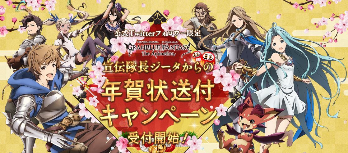 現在、アニメ公式Teitterアカウントのフォロワー全員に、宣伝隊長「ジータ」から2017年のオリジナル年賀状が送られるキャンペーンが実施されている。年賀状には、抽選で景品が当たる『グラブル』のお年玉くじが付いているとのこと。受付は2016年12月31日23:59までなので、希望する人は、公式Twitterアカウントへのフォローを忘れずに行おう。