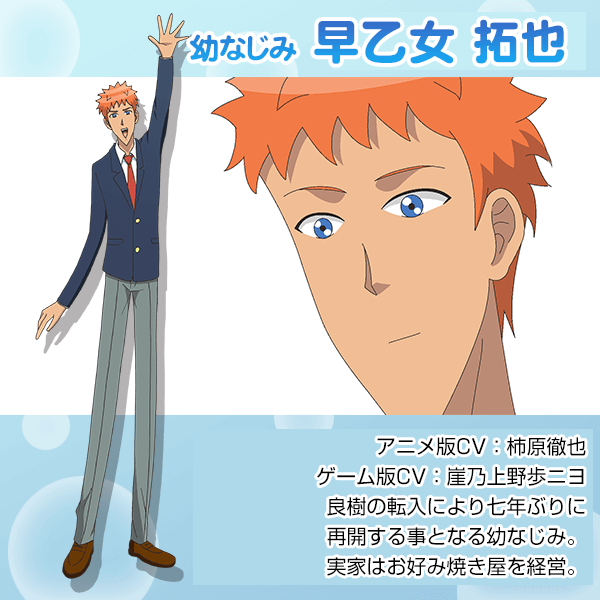 主人公の幼馴染で、「私立薔薇門高校」に通う高校二年生。勉強も運動も苦手だが、面倒見が良く明るい性格の持ち主で誰とでも仲良くなれる。放課後は実家のお好み焼き屋の手伝いをしている。恋愛においてのA型はどのような行動や考えなのか……。多くの恋のライバルがいる中、「早乙女拓也」を観察してみよう!!