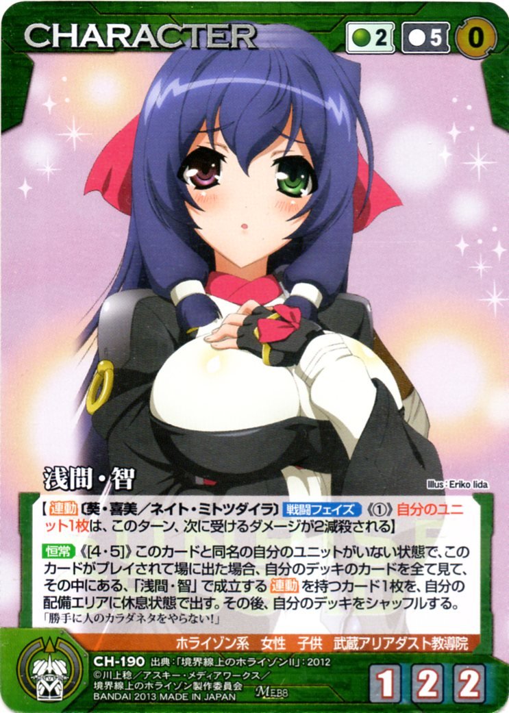 架空の戦国時代をモチーフにした世界が舞台の作品。「浅間・智」は右目が赤色の瞳で、左目は義眼のため翠色をしたオッドアイだ。弓の名手の巫女でありながら、不純で不敵で不遜。エロトークやエロゲーム、酒が好きで、やたらと弓を射たがる。それでも視聴者に愛されているのは、その裏表のないストレートな行動と女性らしい豊満なボディに魅了されているから。天然キャラではないが、やることなすこと全てにおいて常軌を逸しているのも見ていて楽しい。一緒に酒を酌み交わしてバカ話を長々と続けたくなるキャラクターである。