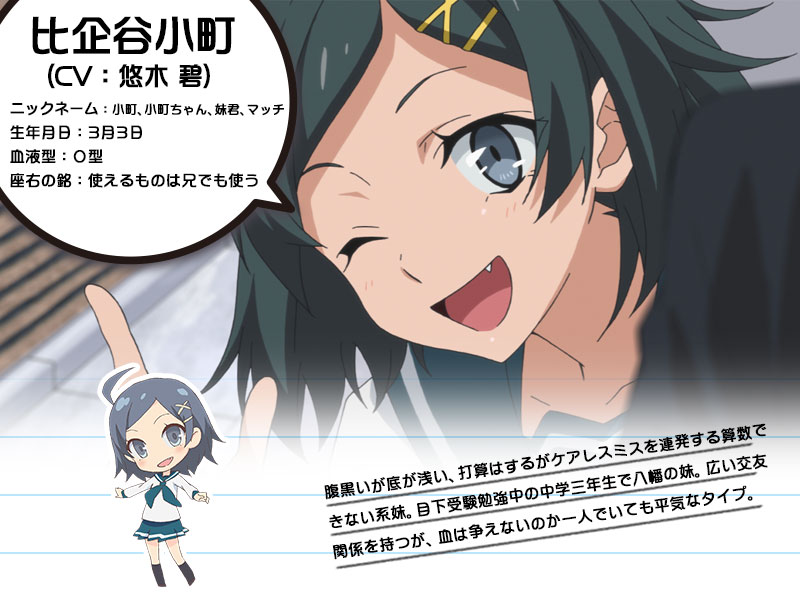 「千葉市立総武高等学校」に通う高校2年生「比企谷八幡」。学力も体力も容姿もそれなりなのに、過去に作った幾多のトラウマにより強い警戒心と猜疑心を抱いており、更に「ぼっち」でいる事に完全に開き直っていて「目と性格が腐っている」と言われる残念男子高校生。「八幡」が書いた「青春とは嘘であり、悪である」という作文をきっかけに教師の「平塚静」により強制的に「奉仕部」に入部させられる。「奉仕部」とは生徒たちの悩みを解決する相談所的な場所であり、当初は部長である息を飲むほどの美少女「雪ノ下雪乃」1人だけだったが、「八幡」とそして同じクラスのクラスの上位カースト女子「由比ヶ浜結衣」が入部させられた。「ぼっち上等!!」だった「八幡」に訪れた決定的なラブコメフラグ!! ……なのだが、やはり「八幡」の残念な性格がそれを許さないのだった。この「八幡」の妹が「比企谷小町」である。中学3年生の「小町」は兄と違いコミュ力が高く、生徒会役員を務め周囲の人たちとも上手くやっている。しかし血は争えず、単独行動も全く平気なタイプでもある。要領が良く打算的であざとい面があり、兄を利用することにも長けている。それなりに兄を立て、それなりに扱ってはいるが、兄のことは大好きであり、良き理解者でもある。学校の成績は「八幡」に「アホの子」呼ばわりされる残念なレベル。そんな「小町」はぴょこんと飛び出たアホ毛と八重歯がトレードマークの美少女である。兄の彼女候補探しに積極的な面もある「小町」。果たして彼女の働きで「八幡」に楽しい学生生活は訪れるのだろうか……!? それは神のみぞ知る……。
