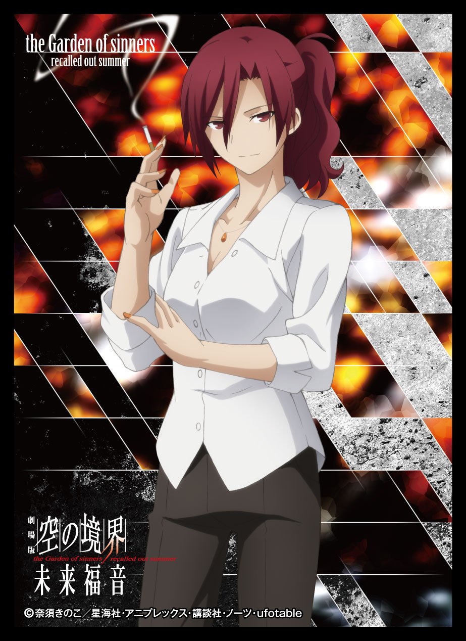 ヘビースモーカーといえば、常にタバコをくわえていて、赤いセミロングの髪が特徴的な『空の境界』の「蒼崎橙子」だ。メガネの着用で性格が変化する二重人格の持ち主で、眼鏡をかけている時は主観的で人情家、外している時は客観的で酷薄。顔立ちは大人っぽいが、妙に残るあどけなさがタバコと良いギャップを生み出している。特に、メガネを外している時の喫煙シーンでは、その挑発的な表情が普段の性格との差を生み、たまらない!! という視聴者も多いのではないのだろうか?