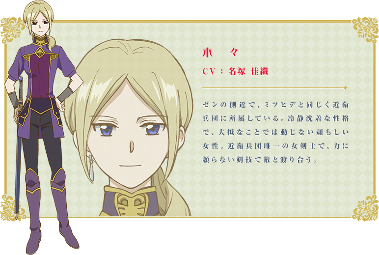 生まれつきリンゴの様な美しい赤い髪をした少女「白雪」。彼女は生まれ育った国「タンバルン王国」で薬剤師として働いていたが、この国の王子でそのワガママっぷりから「バカ王子」との悪名高い「ラジ」に珍しい髪色というだけで愛妾として迎えられそうになる。それを拒否して、国を出た「白雪」はたどり着いた隣国の森で「ゼン」という少年と出会う。「ゼン」は実はこの隣国「クラリネス王国」の第二王子。「ゼン」の助けを受け、「クラリネス王国」で暮らすことに。宮廷薬剤師になることを決意した「白雪」は、髪色のせいで起こる様々な事に立ち向かいながらも「ゼン」や周囲の人々と信頼関係を築き、強く前へ進んで行くのだった。「ゼン」の側近の1人が「木々・セイラン」である。近衛兵団唯一の女性剣士であり、左利きの「木々」。彼女は非常に冷静沈着な性格で、多少の事では全く動じない。剣の腕も相当に高く、非常に美人で「セイラン子爵家」の次期当主でもある。「白雪」が憧れる「木々」。左手に持った剣で立ち回る姿は同性から見ても非常に凛々しく素敵なのである。
