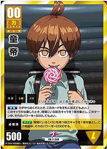 いつからか地球を侵略するため名だたる悪が幾度となく現れるようになった世界。日本のみならず地球の平和を守るために様々な「ヒーロー」たちが悪へと立ち向かっていった。そんな中、日本のあるアパートの1室に自称の「ヒーロー」がいた。彼の名は「サイタマ」。一見全く強そうではない彼だが実はどの「ヒーロー」よりも強いのである。その理由はすべての敵を「ワンパン(ワンパンチ)」で倒してしまうからであった。最強の「ヒーロー」であるがどこか頼りないこの「サイタマ」とその仲間たちどの戦いとギャグに彩られたヒーローコメディアニメ。この作品において「ヒーローランク」がS級5位である「童帝」を「高山みなみは演じた。これまたキャラとしては10歳の少年という彼女にぴったしの設定。「ヒーロー」たちが所属する「ヒーロー協会」において作戦を考えたりと参謀のような役割をも担う天才少年である。一見「コナン」とも被るようなキャラクターではあるがもっとクールな性格を持っている。そのため、トーンは抑え目でより頭が切れるキャラクターであることを強調している。