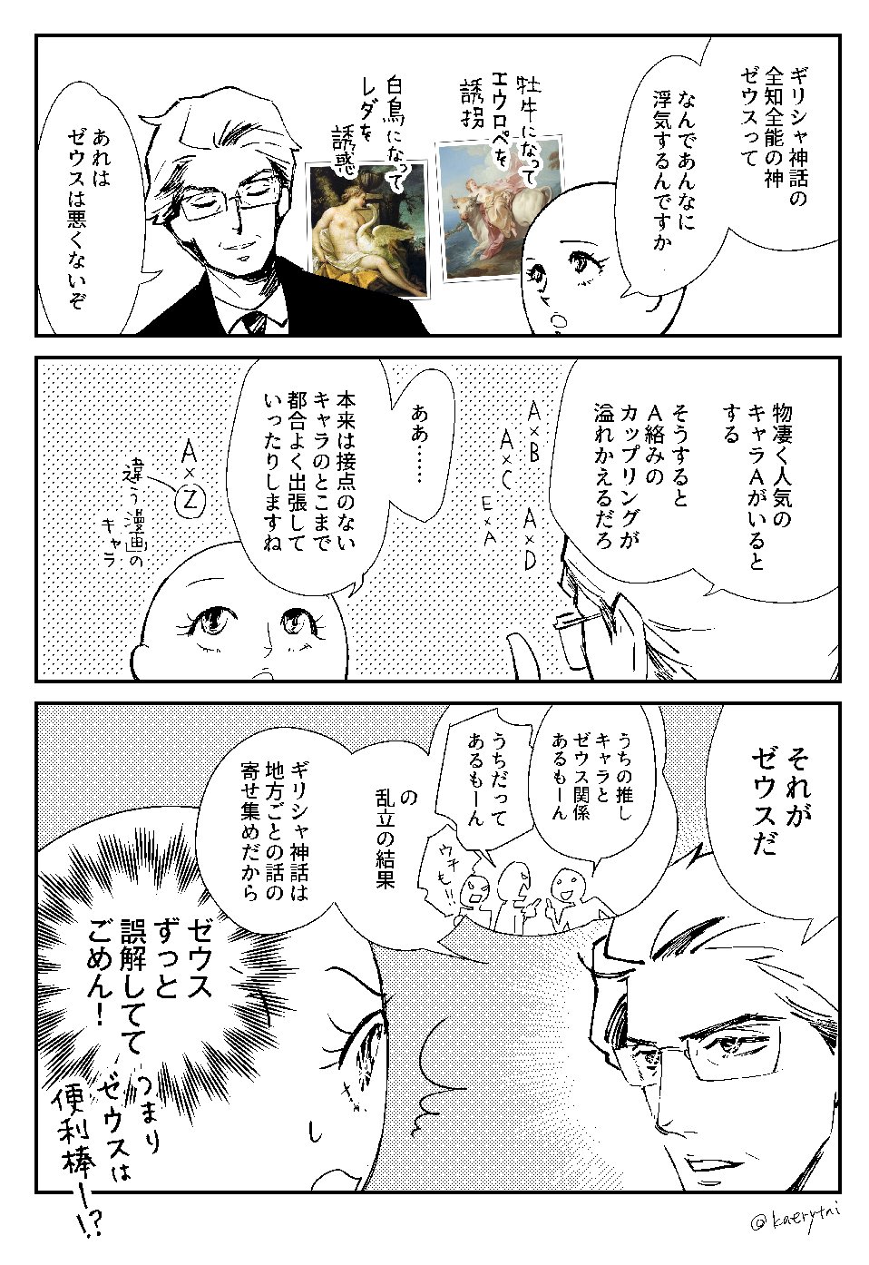 ギリシャ神話の神々から、コミケの会館の名前まで話題豊富な社長。しかし、マニアック過ぎて「一般人にはわかんねー!」 という読者の心の声を「カエリ鯛」がツッコミ役として代弁している。しかし、職場の、しかも社長と趣味の話が出来るとは微笑ましい。いや、微笑ましい通り越して羨ましい。こんな会社で働いてみたくなる。
