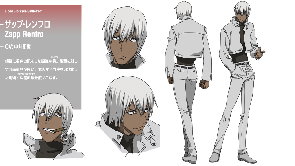ある事件をきっかけに、一晩で「異界」と「人界」が交わる街へと姿を変えてしまった「ニューヨーク」。ここでは、日常的に超常的な犯罪が起こっている。そんな街を守るため秘密裏に戦っている組織「秘密結社ライブラ」。そこの社長をしている「クラウス・V・ラインヘルツ」の命を狙っているのが、「中井和哉」演じる「ライブラ」の社員「ザップ・レンフロ」だ。自分の血液を変化させ、且つ炎の属性を持たせて武器とする「斗流血法・カグツチ」を自在に操り戦う。周りからは短気でケンカっ早くだらしないチンピラという印象を持たれ、ダメ男として扱われている。確かに皆の言うようにしょうもない生活を送っているが、戦闘では一転して頼りになる存在だ。また、意外にも仲間思いで身内の危険には敏感に反応し、危険が及んだ時は想定外の支援をする事もある。見た目とのギャップ差が激しい、実は優しいキャラクターである。