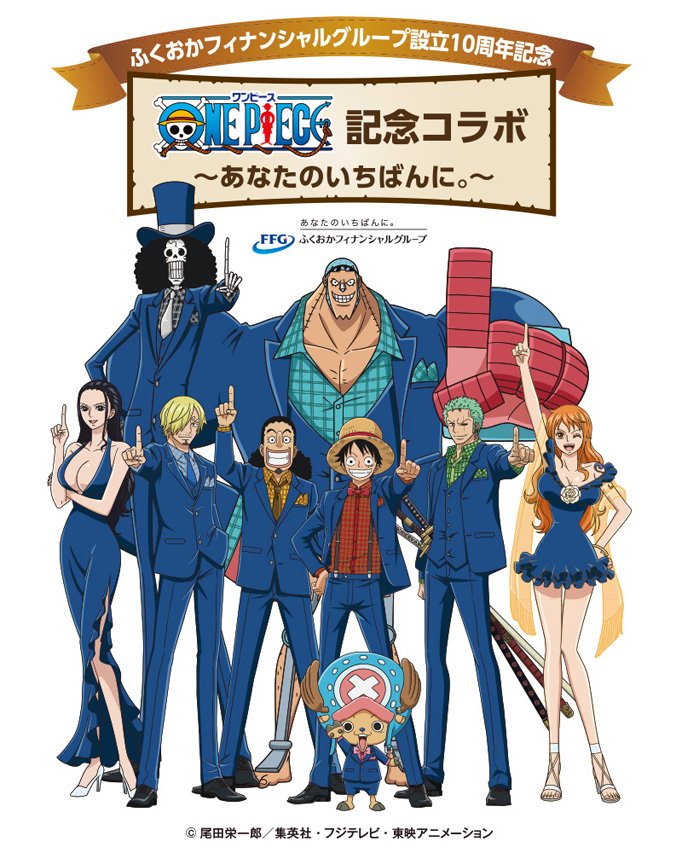 「株式会社ふくおかフィナンシャルグループ」は、設立10周年記念事業として、アニメ『ONE PIECE』 との記念コラボ企画を実施した。多くのファンから愛され続ける『ONE PIECE』で描かれる“仲間との友情や夢への挑戦”といった壮大な世界観と、「FFG」設立10周年記念事業のスローガンで掲げる“地域とともに 新しい未来へ”の想いをひとつにつなぎ、約半年間に亘り、様々なキャンペーンを展開する。