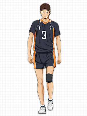 烏野高校背番号3。普段は気が弱くヘタレであるが、一度試合の為にコートに上がれば雰囲気が変わる。烏野高校には数少ない長身選手で3枚ブロックを打ち抜くほどのパワーを持っている。一時はことごとくスパイクをブロックされ続け、罪悪感から部活を離れてしまっていた。しかし「日向」と「影山」が入部し、2人に説得され部活に復帰するようになる。合宿後からサーブの練習に力を入れる様になり、よりエース感がにじみ出る様になった。