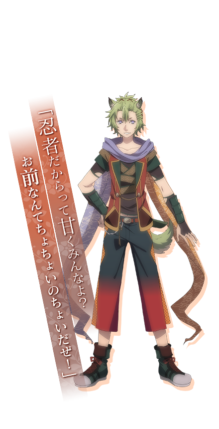 変幻自在、俊敏で勝気な忍者。勘が鋭く頭の回転も速いが、勉強が苦手。落ち込むと仲良しの猿に話を聞いてもらう。
