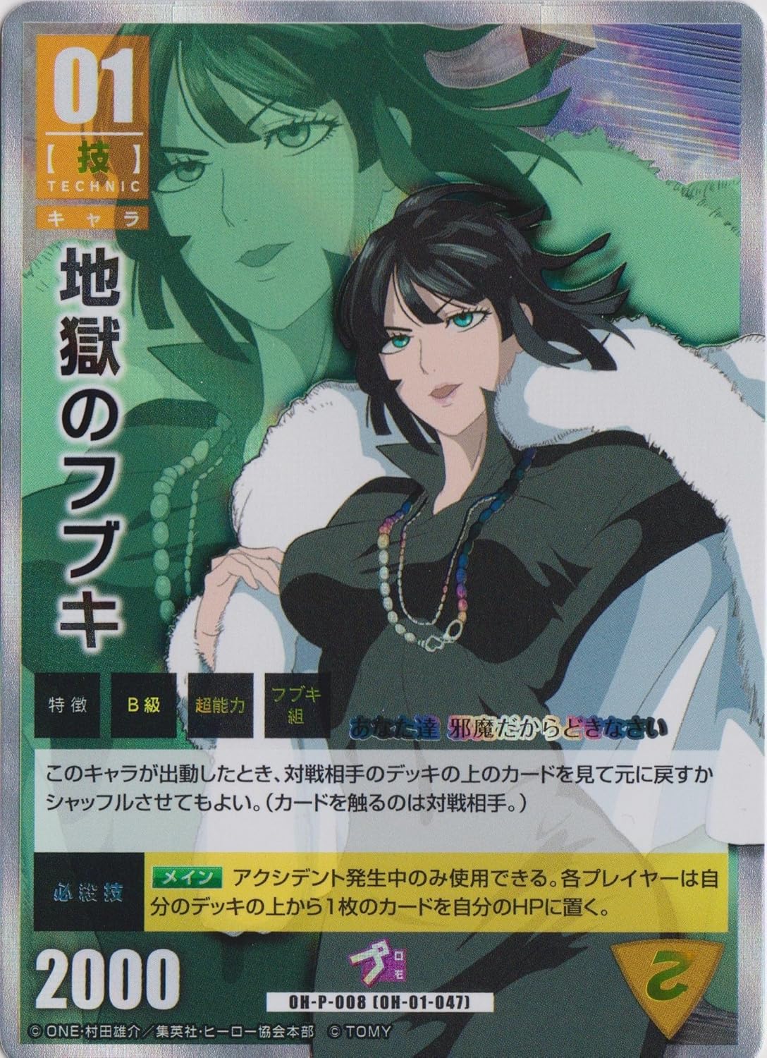 ヒーロー協会に所属するヒーローでB級1位の23歳。黒髪に黒のドレスコートが特徴的。そんなヒーローが組織に属して敵を倒す事も大事だが、組織内でどのように生きて行くのか、人生ドラマや人間関係の機微を描いた作品にもなっている。主人公「サイタマ」は、ヒーローとしての肩書きよりも悪を倒す事が最優先される事を信条にしており、そのヒーローの本来の姿に感化されていくヒーロー協会のメンバーの心を入れ替える姿が面白くもあり美しくもある。「フブキ」も当初は「サイタマ」を自身の取り巻きグループの一員に組み込もうとしたが失敗し、「サイタマ」の行動に理解を示して行く。そんなヒーローたちがギャグも交えてつつも真のヒーロー像を探す物語でもある。