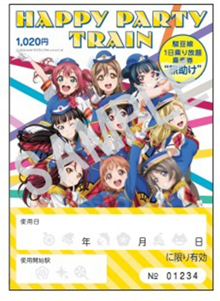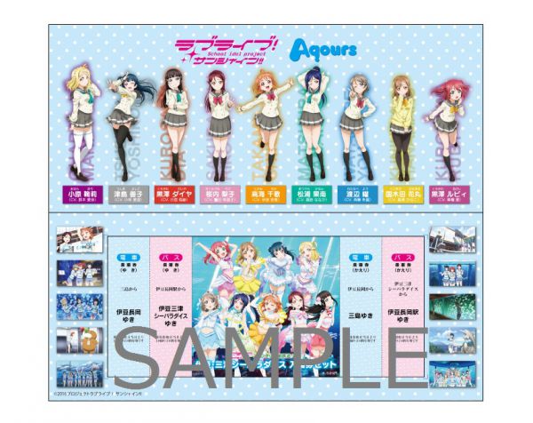 「Aqours」9名が歌う2ndシングル「恋になりたい AQUARIUM」のPVには伊豆「三津シーパラダイス」が舞台として登場しており、このセット券の台紙でも主人公たちが同水族館で楽しむ様子がデザインされている。台紙(横247㎜ 縦見開き214㎜)に鉄道・バス・水族館のセット券1枚を貼付している。