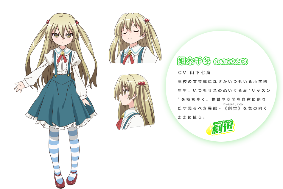 「泉光高校」文芸部の「安藤寿来」は異能バトルに憧れる重度の厨二病患者。他の4人の部員たちはそんな「寿来」に呆れながらも平和に過ごしていたのだが、突如として文芸部員たちは「異能」を手に入れてしまう。とはいえ何かが起こることもなく、かくして彼らはせっかくの異能を無駄使いする事に決めたのだった……。この文芸部の一員が「姫木千冬」である。彼女は文芸部顧問の姪で、放課後、文芸部に入り浸っている小学4年生。万物を創り出すことが出来る異能「創世(ワールドクリエイト)」を持っている。いつもリスのぬいぐるみ「リッスン」を持ち歩き、機嫌が悪くなると「リッスン」を腹話術のように使って自分の言葉を代弁させている。いかにも小学生らしい可愛い行動だ。それぞれの異能が巻き起こす、ゆる~い日常を覗いてみては!?