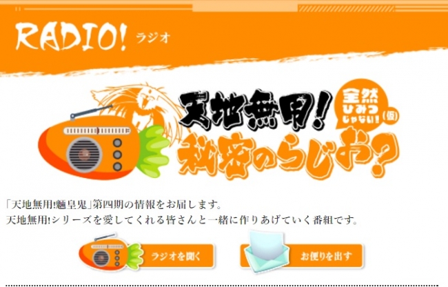 『天地無用』第4期を十倍楽しめる「天地無用!秘密のらじお」。『天地無用! 魎皇鬼』第4期の情報など、天地無用ファンと一緒に作りあげていく番組。