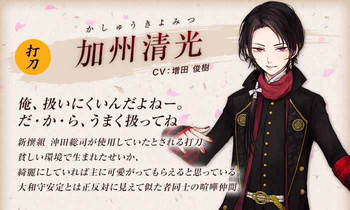 「大和守安定」は新撰組のダンダラ羽織を着用した美少年の姿をしており、「沖田総司」の逸話にも相応しい。しかしそのような見た目にも関わらず、戦闘時には「首落ちて死ね」など、荒れた言葉遣いになるという意外性も持つ。