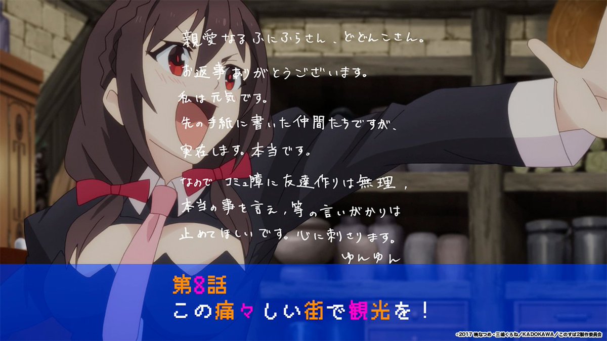 本日3/1(水)に放送される『この素晴らしい世界に祝福を!2』第7話の次回予告が公式サイトにて公開中。な、なんと次回予告は3週連続「ゆんゆん」!! 「コミュ障に友達作りは無理、本当のことを言え、等の言いがかりは止めてほしいです。心に刺さります。」 最速放送は「TOKYO MX」より25:05~、お見逃しなく!!