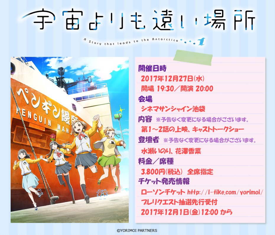 2018年1月放送のTVアニメ『宇宙よりも遠い場所』先行上映会の開催が決定した。